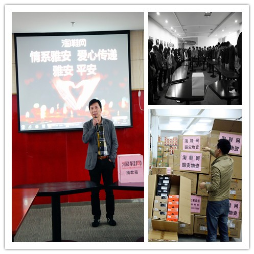 災(zāi)情發(fā)生后幾個(gè)小時(shí),淘鞋網(wǎng)迅速反應(yīng),王冬竹董事長(zhǎng)立即召集公司全體高管召開緊急大會(huì),指示緊急啟動(dòng)淘鞋網(wǎng)愛心公益基金支援雅安災(zāi)區(qū),并第一時(shí)間對(duì)外承諾向雅安捐贈(zèng)返回