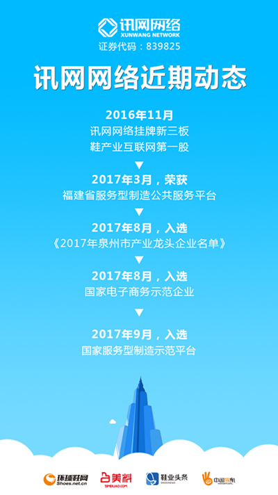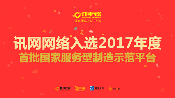 “近日,工信部發布《2017年服務型制造示范企業(項目、平臺)名單》,訊網網絡(證券代碼:839825)以全程式、智能化鞋產業公共服務平臺的模式,成功入選服務型制造示范平臺組名單。這是訊網網絡在連續四次入選商務部公布的“電子商務示范企業”名單后的再一國家級殊榮?!?br />