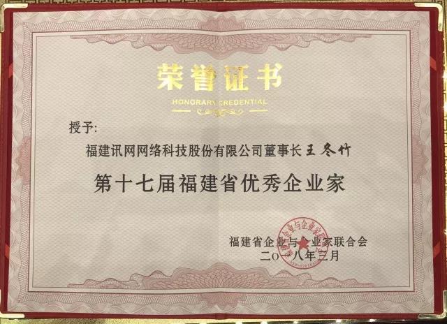 5月19日,第十七屆福建省優秀企業家表彰大會在福州召開,福建省副省長鄭新聰等領導出席,共有122名優秀企業家獲此殊榮,訊網網絡董事長王冬竹榜上有名。