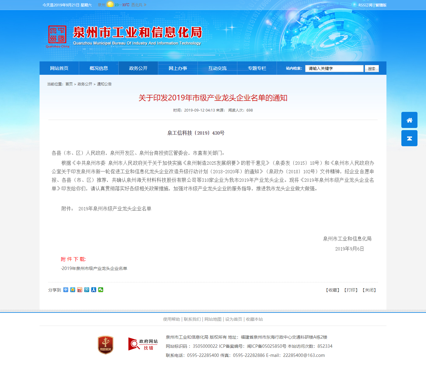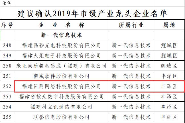 據(jù)泉州市工業(yè)和信息化局發(fā)布的名單公告中,共確認310家企業(yè)為2019年市級產(chǎn)業(yè)龍頭企業(yè),福建訊網(wǎng)網(wǎng)絡(luò)科技股份有限公司(以下簡稱“訊網(wǎng)網(wǎng)絡(luò)”)入選“新一代信息技術(shù)”行業(yè)領(lǐng)域龍頭企業(yè)。