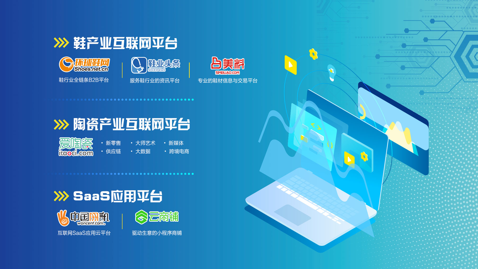 訊網(wǎng)網(wǎng)絡(luò)依托于晉江制鞋產(chǎn)業(yè)集聚區(qū)的特色優(yōu)勢,服務(wù)于鞋產(chǎn)業(yè)上中下游企業(yè)的鞋產(chǎn)業(yè)互聯(lián)網(wǎng)平臺,建立線上線下服務(wù)體系,以用戶為中心,由單一的“消費端”升級轉(zhuǎn)為“產(chǎn)業(yè)端”的升級,通過互聯(lián)網(wǎng)科技與產(chǎn)業(yè)鏈融合的手段,實現(xiàn)鞋行業(yè)全產(chǎn)業(yè)鏈高效、低成本運行,打造“鞋產(chǎn)業(yè)互聯(lián)網(wǎng)”生態(tài)圈。